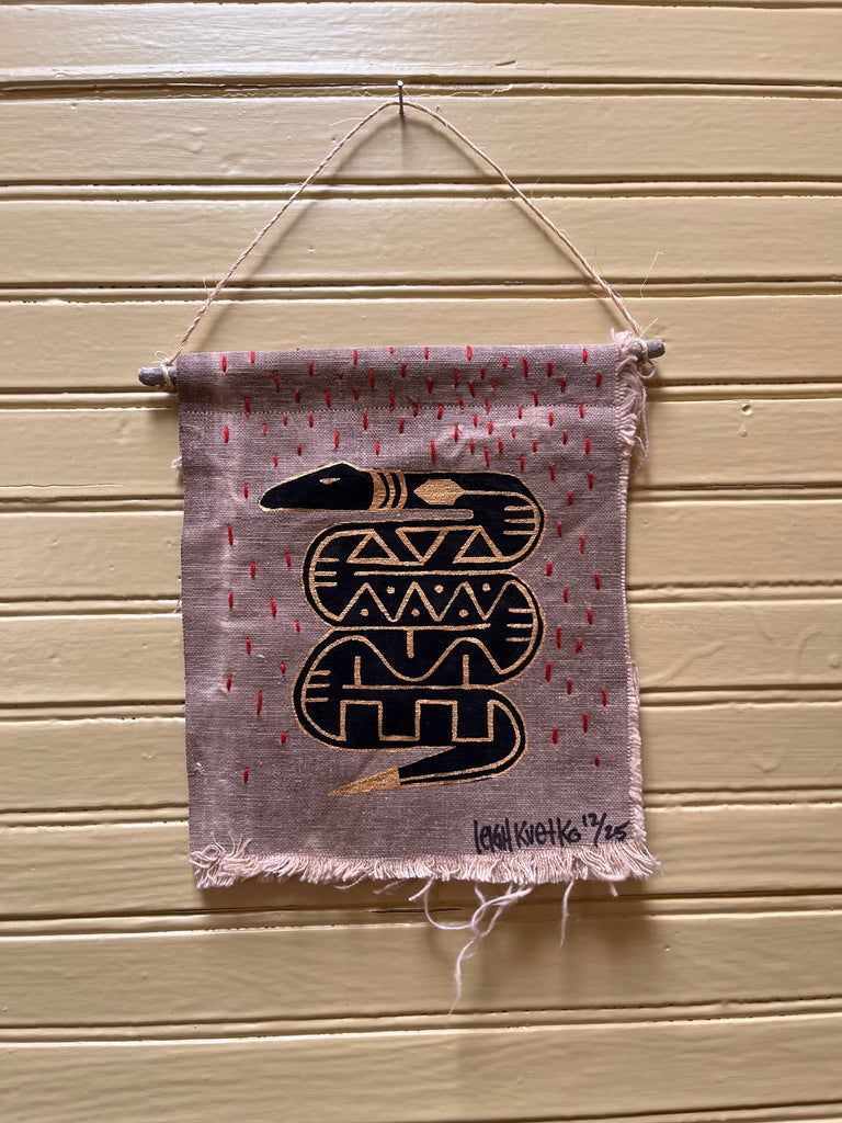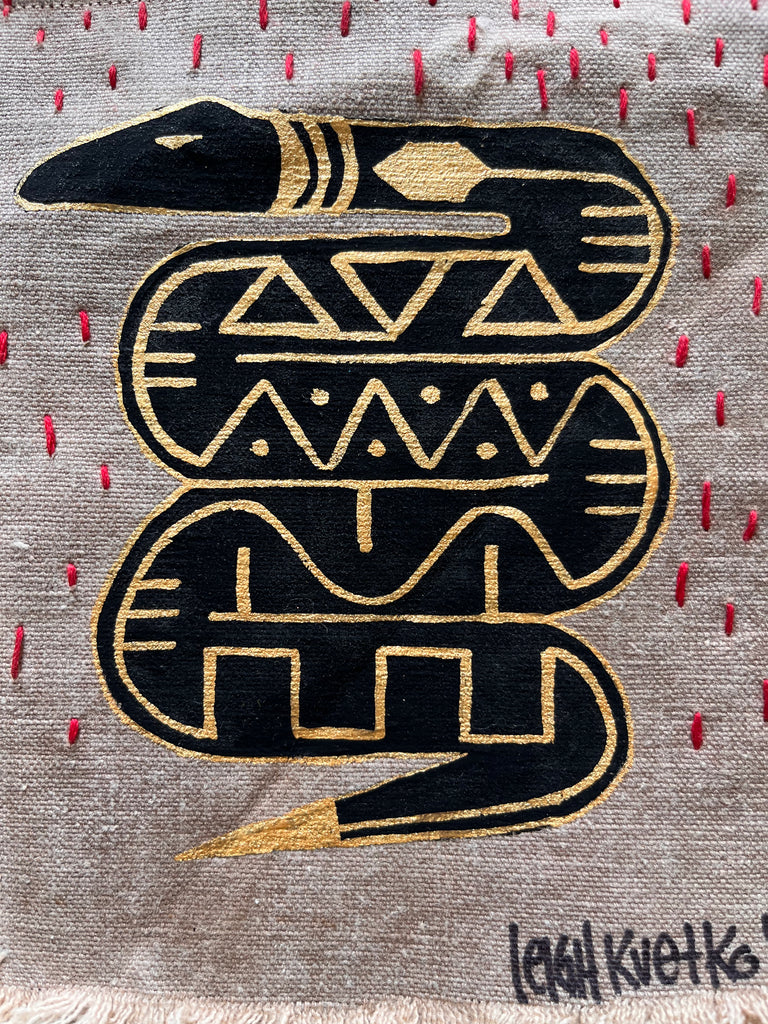 Stylized snake painted on distressed vintage canvas with super black, gold acrylic.